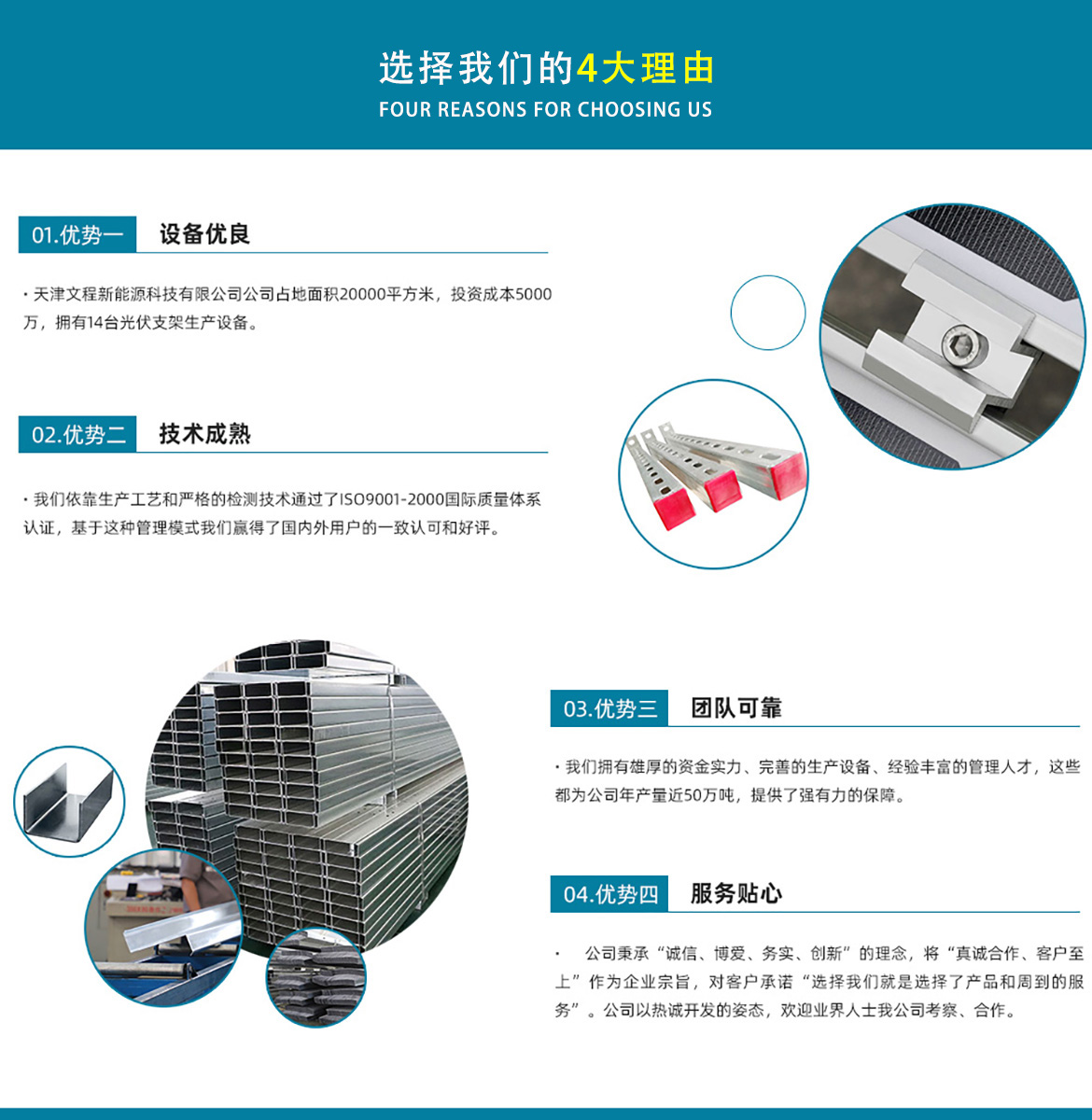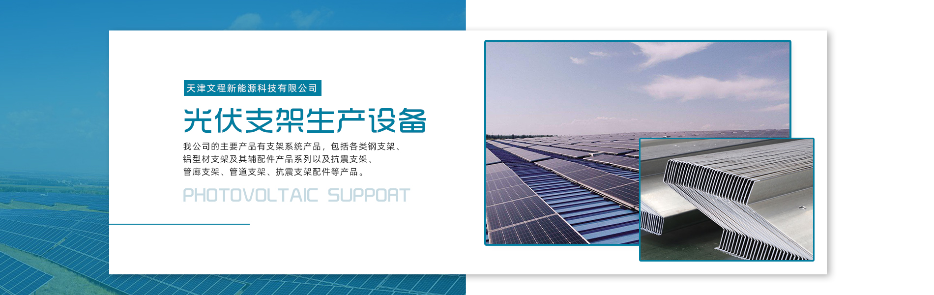 關(guān)于我們天津文程新能源科技有限公司成立于2021年,是專注于集中式、分布式、漁光互補(bǔ)和農(nóng)光互補(bǔ)等清潔能源發(fā)電的綜合性企業(yè) 公司是集設(shè)計、研發(fā)、生產(chǎn)、制造為一體的綜合型企業(yè)。公司占地面積20000平方米,注冊資金5000萬元整。公司坐落于華北鋼鐵重鎮(zhèn)--大邱莊,距天津市區(qū)50公里、鄰104和205國道及京滬高速,交通十分便捷。 本公司擁有三個生產(chǎn)車間,其中兩個冷彎型鋼車間,一個鋅鋁鎂型鋼車間,擁有自動冷彎成型機(jī)10條,自動數(shù)控沖孔機(jī)10條以及焊接加工等設(shè)備。主要生產(chǎn)產(chǎn)品有:太陽能光伏支架、各種規(guī)格的C/Z/U型鋼、抗震支架、管廊支架及整套配件等。